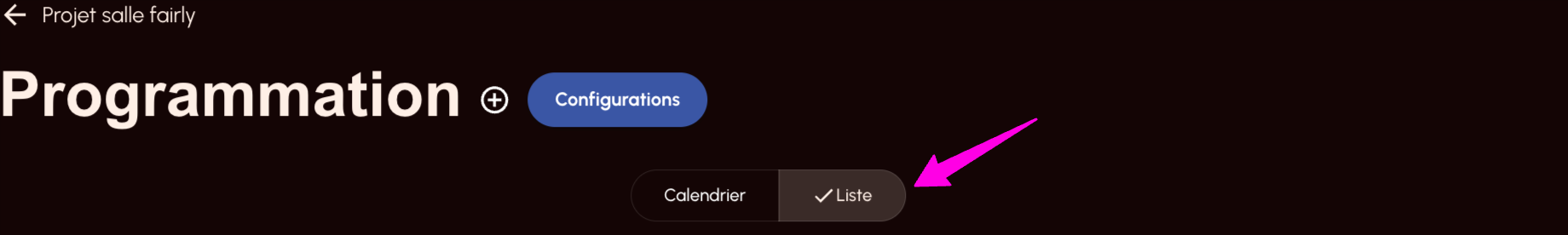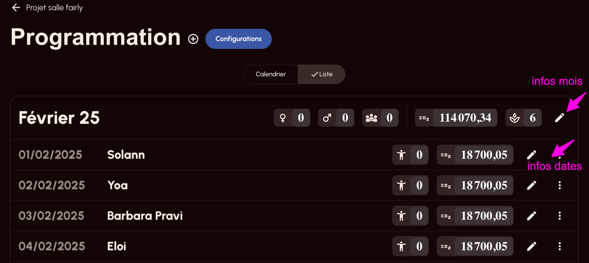 Une fois les dates chargées, passez sur la vue Liste pour les modifier, compléter les questions au niveau de la date, et du mois, et attribuer / modifier la configuration