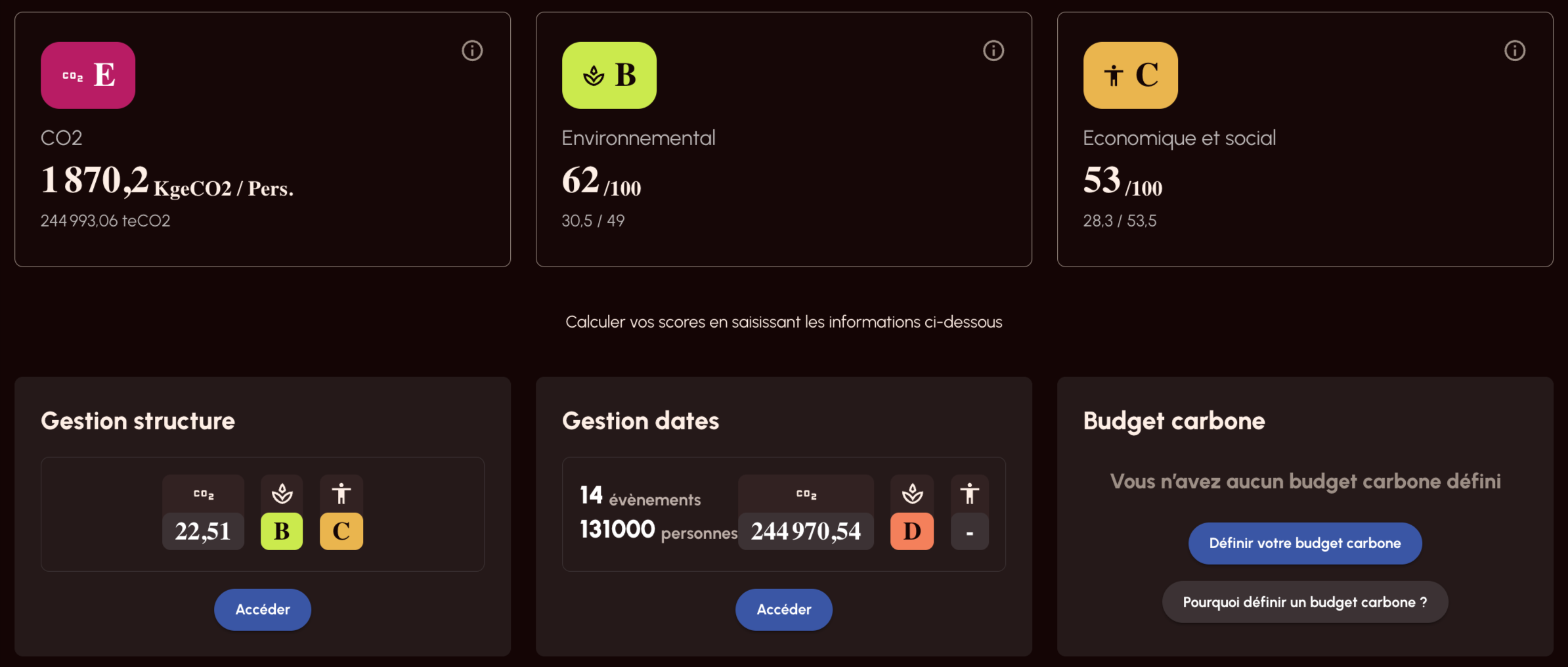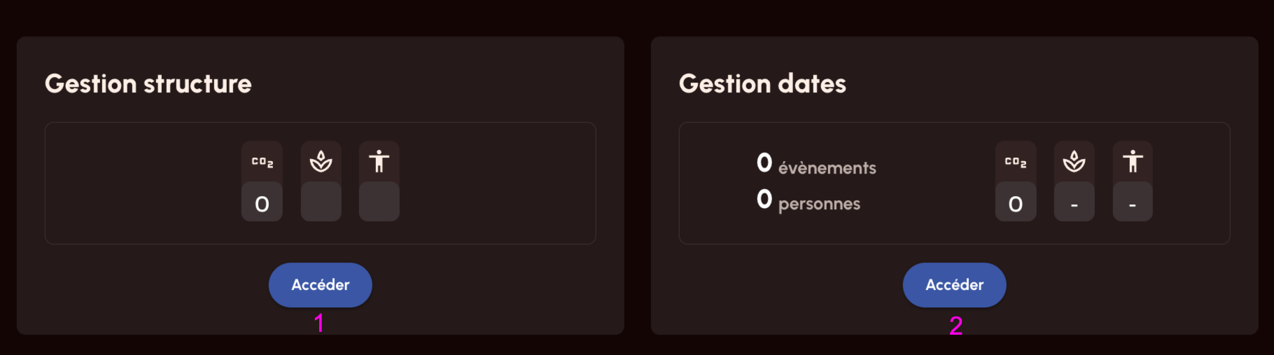 Deux modes de saisie des données pour calculer votre impact : celles liées au fonctionnement de votre structure, et celles aux dates de votre saison. Nous vous conseillons de commencer par remplir les informations liées à la structure, puis de renseigner votre programmation dans Gestion dates