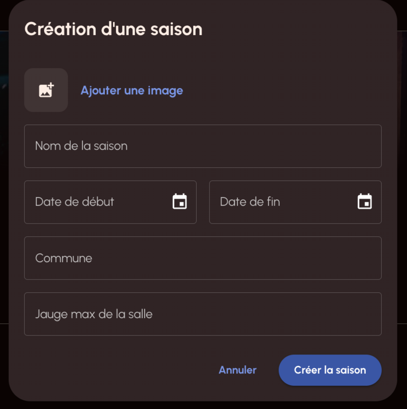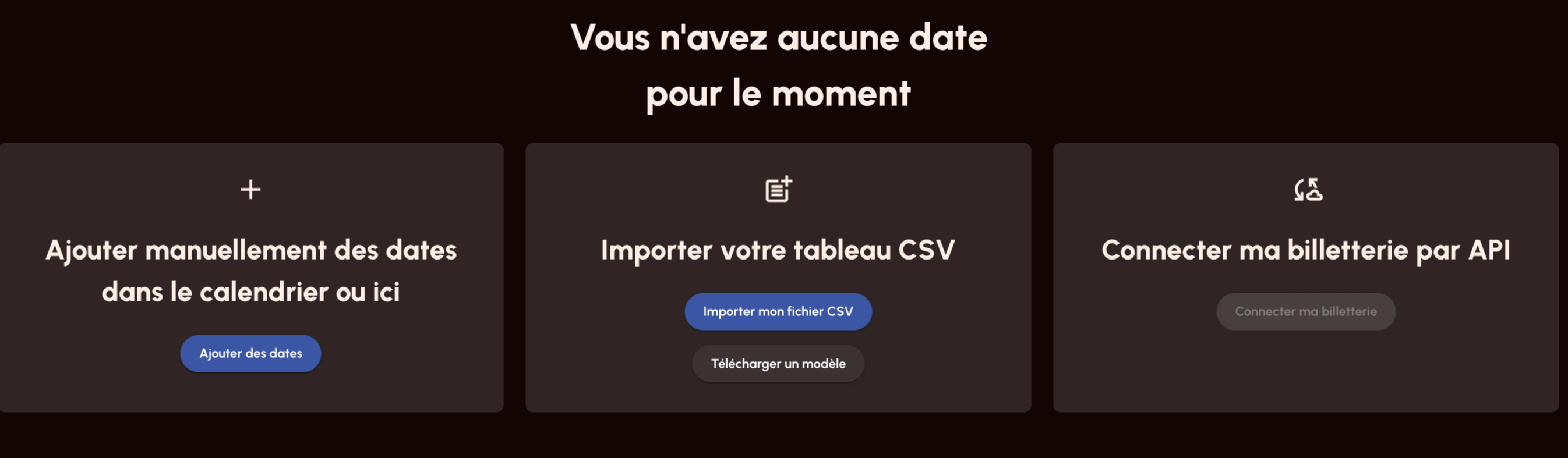 Pour l'ajout des dates de votre saison, plusieurs options sont proposées : ajout manuel ; import CSV ; Connexion API (à venir)
