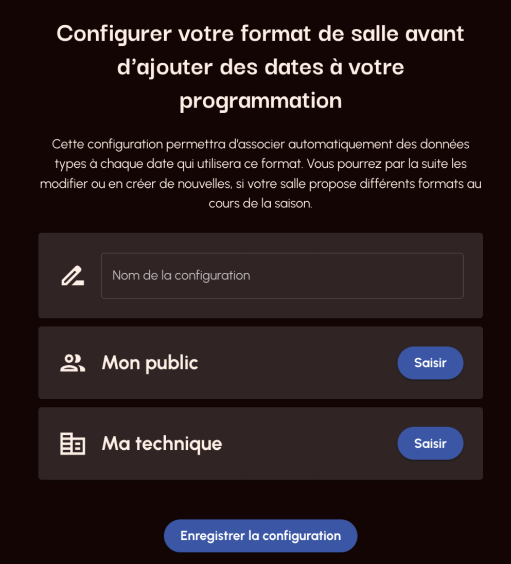 Lorsque vous accéder à la section Gestion dates, il vous sera demandé de configurer votre format de salle. Cete configuration permet ensuite d'associer directement des données type aux dates de votre calendrier. Vous avez la possibilité ensuite de créer plusieurs configurations adaptées aux différents formats de votre salle (assis, debout, club, grande jauge, petite jauge, etc.)